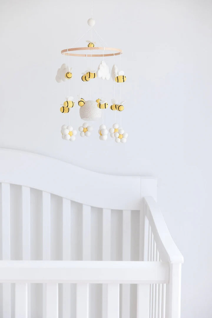 The dreamiest mobile in our Adventure collection. Hang our Balloon mobile above your newborn's crib, and watch your little one's eyes sparkle with joy. The touch of white along with the variety of muted colors bring in a peaceful balance, allowing your baby to feel calm as they look at wool-stuffed hot air balloons hovering above their head!