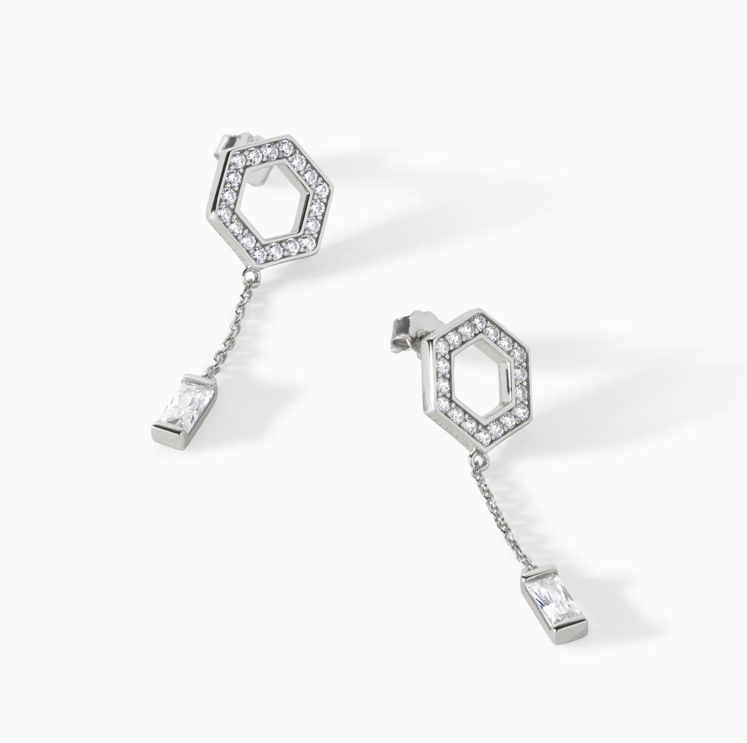 Let your confidence shine through your eyes and on your ears in the Tyra drop baguette earrings. Featuring a dazzling baguette stone, elegantly suspended from our signature CZ-encrusted hexagon shaped stud, connected by a delicate yet unyielding chain - ensuring that these remarkable earrings gracefully sway with your every move.